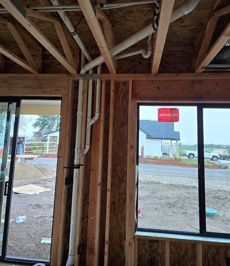 Rough-in plumbing happens after framing is complete and before insulation or drywall. This phase includes running supply lines to fixture locations, installing drain and vent pipes according to slope and diameter requirements, and positioning stub-outs where sinks, toilets, showers, and appliances will eventually connect. In Lane County, inspections verify that venting meets current code and that water distribution lines are correctly sized for the home's layout and fixture count.